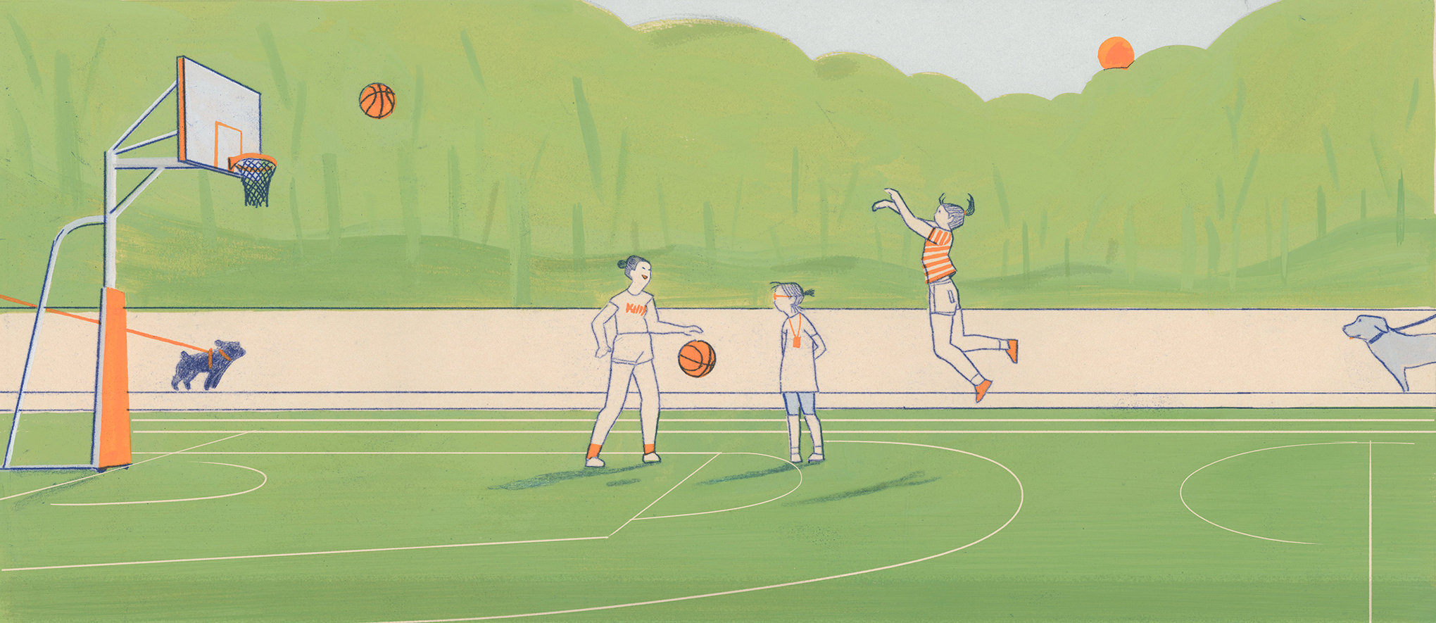 우리 동네 공원은 농구장이 새로 생긴 뒤로 농구붐이 일어났다! 남녀노소 할 것 없어, 산책하는 개들에게도 인기만점!